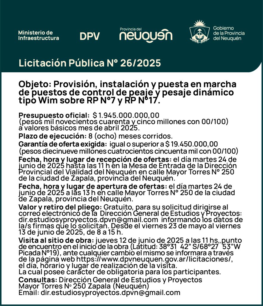 Licitación Pública Nº 26/25- Objeto: Obra de Provisión e Instalación y Puesta en Marcha de Puestos de Control de Peaje y Pesaje Dinámico Tipo Wim sobre Ruta Provincial N°7 y Ruta Provincial N°17