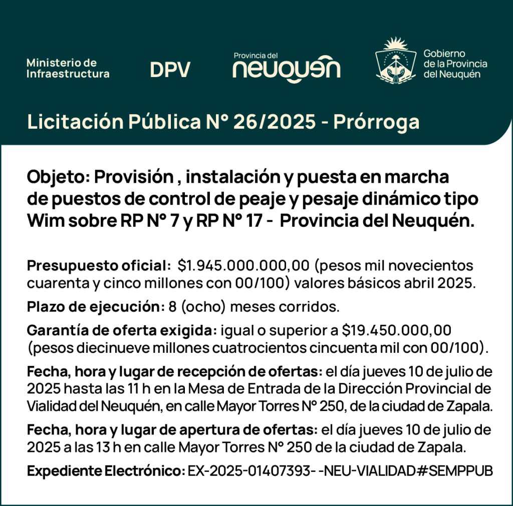 PRÓRROGA Licitación Pública Nº 26/25- Objeto: Obra de Provisión e Instalación y Puesta en Marcha de Puestos de Control de Peaje y Pesaje Dinámico Tipo Wim sobre Ruta Provincial N°7 y Ruta Provincial N°17
