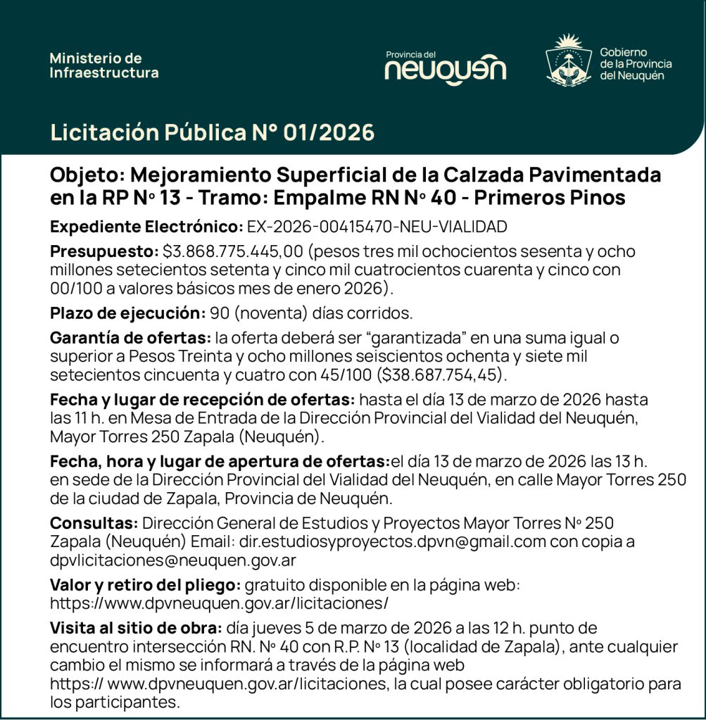 LICITACIÓN PÚBLICA N°01/2025 – U.P.E.F.E. – OBRA: «PAVIMENTACIÓN RUTA PROVINCIAL N°63» TRAMO: EMP. RUTA NAC. N°40 – EMP. RUTA NAC. N°237 – SECCIÓN: RUTA NAC. N°40 – KM 20 (PROG.18+889,80 M) PROVINCIA DEL NEUQUÉN.